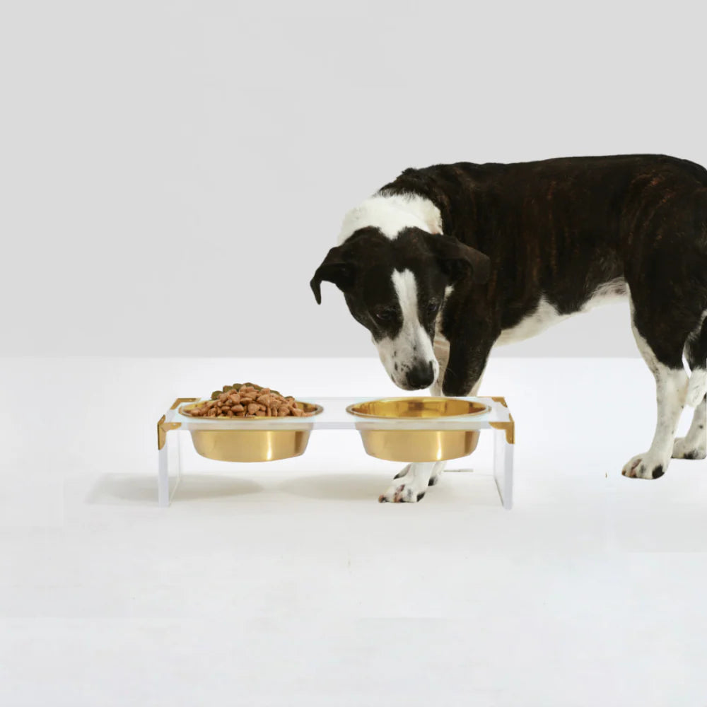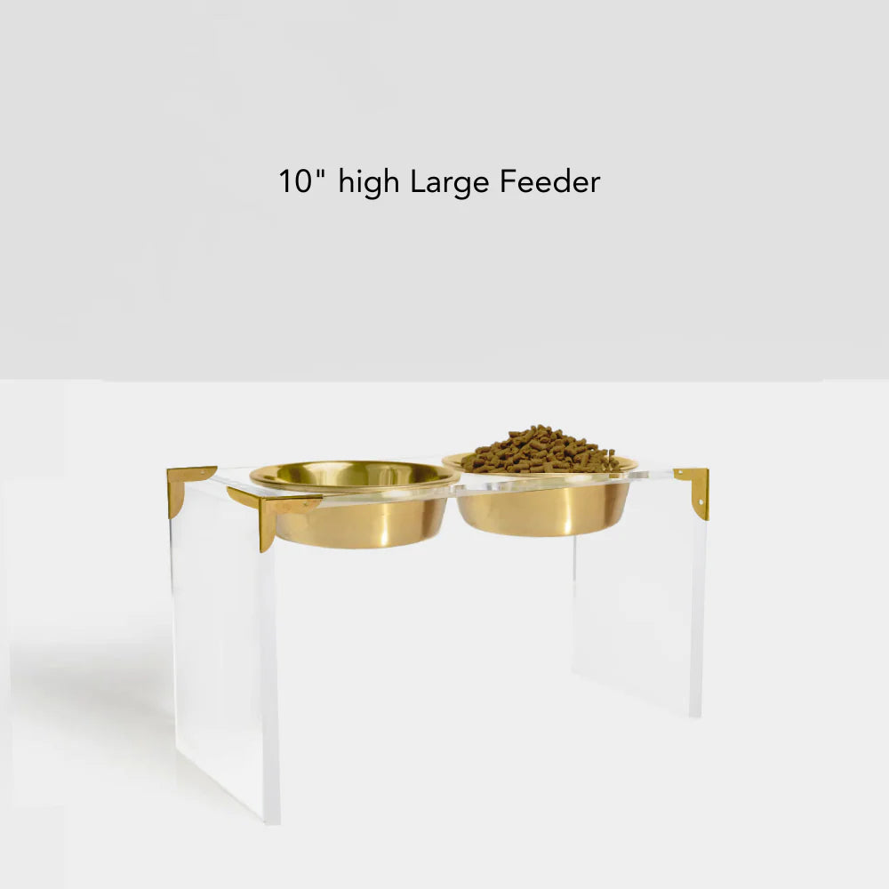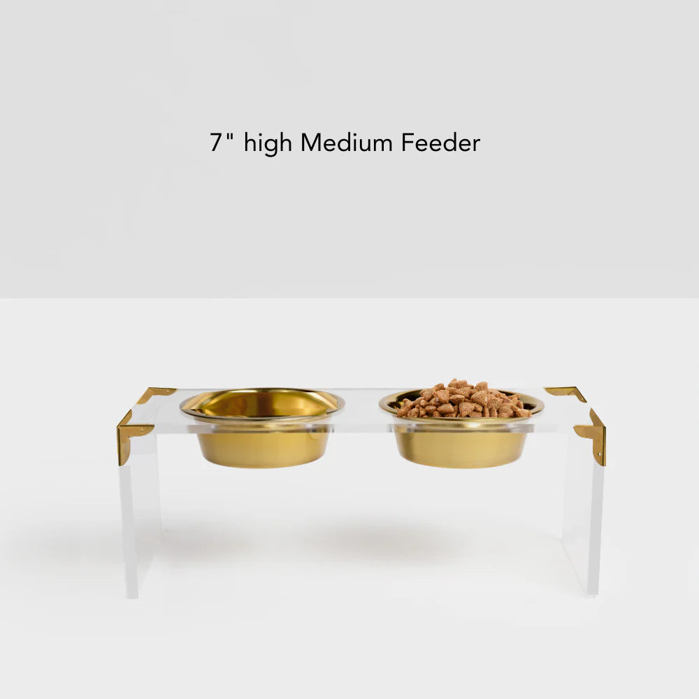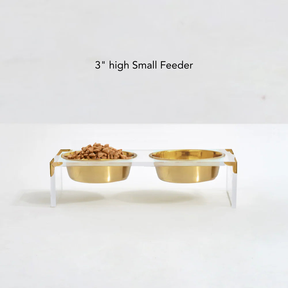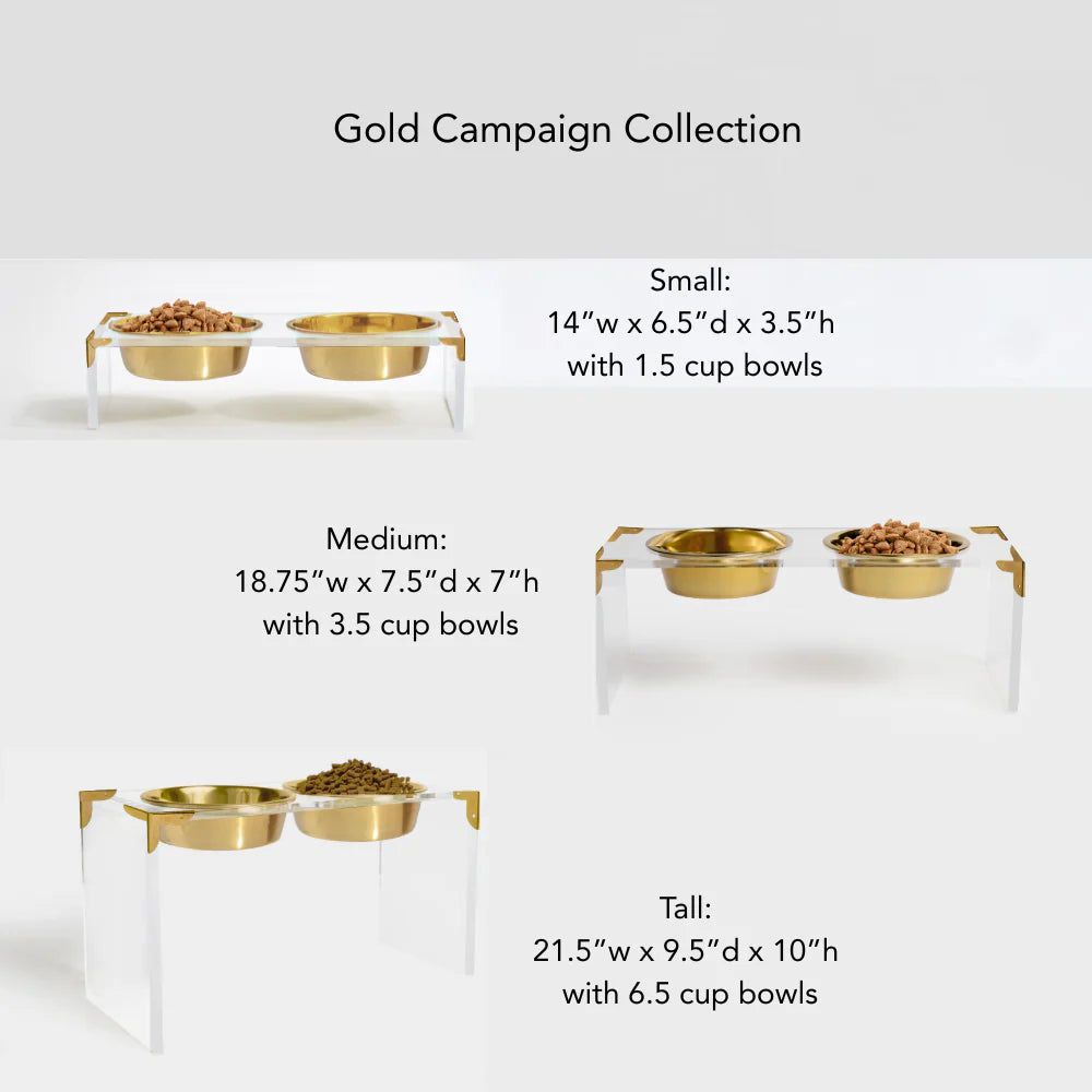 Add sophistication and style to your pet’s mealtime with the Campaign Corners Gold Feeder. This elevated feeder combines clear acrylic with sleek gold metal corner brackets, creating a modern design that complements any home décor. The gold bowls are non-toxic, powder-coated, and should be hand washed only to maintain their beautiful finish.