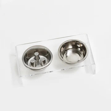 Elevate mealtime with our premium Stainless Steel Slow Feeder and Water Bowl Set. Designed for both function and elegance, this two-piece set includes a 1-quart slow feeder and a matching 1-quart water bowl. The polished stainless steel finish adds a sleek, modern touch to any kitchen or feeding station. The slow feeder helps your dog eat up to three times slower, promoting better digestion and reducing bloating. Both bowls are dishwasher safe for effortless cleaning, and the slow feed prongs are removable for easy washing. This set is perfectly sized to fit our Clear Double Feeder with Slow Feed & Water Bowls, making it the ultimate pairing for style and practicality. Ships in approximately three weeks.