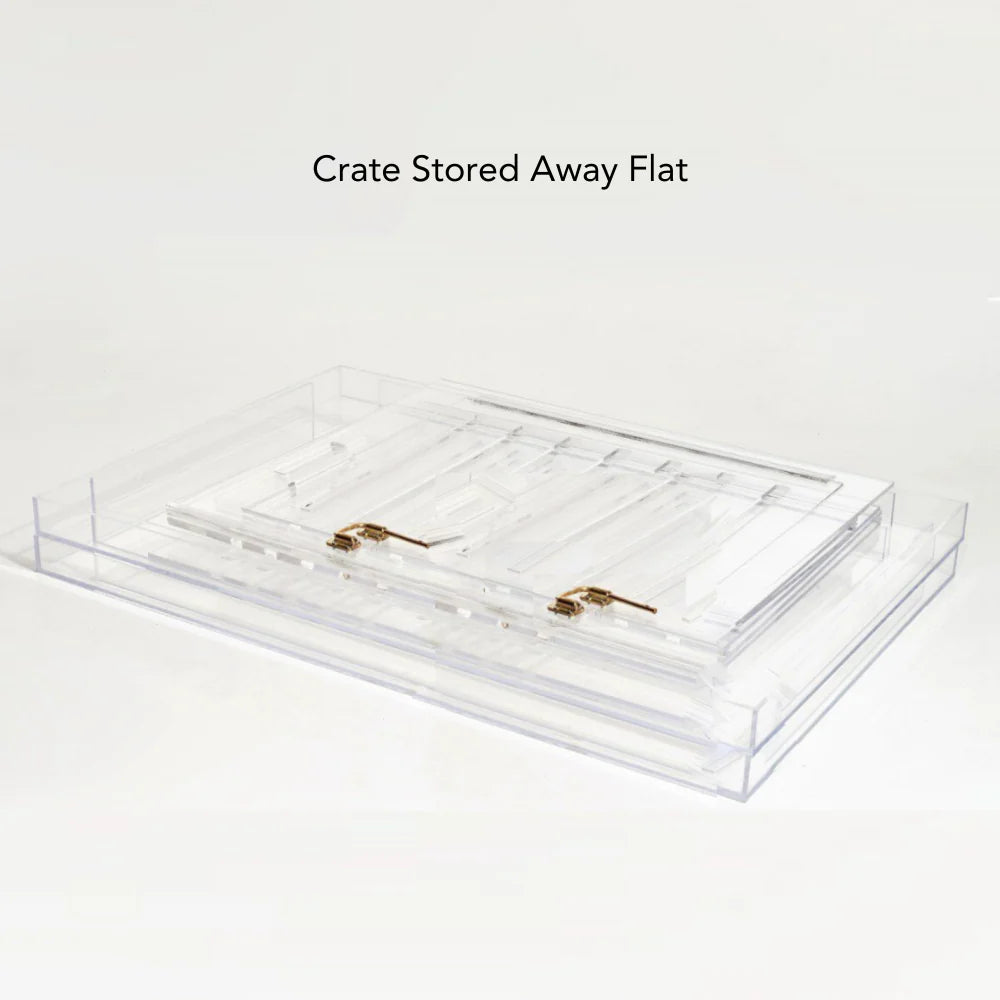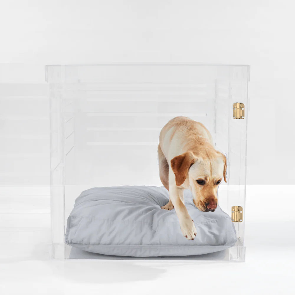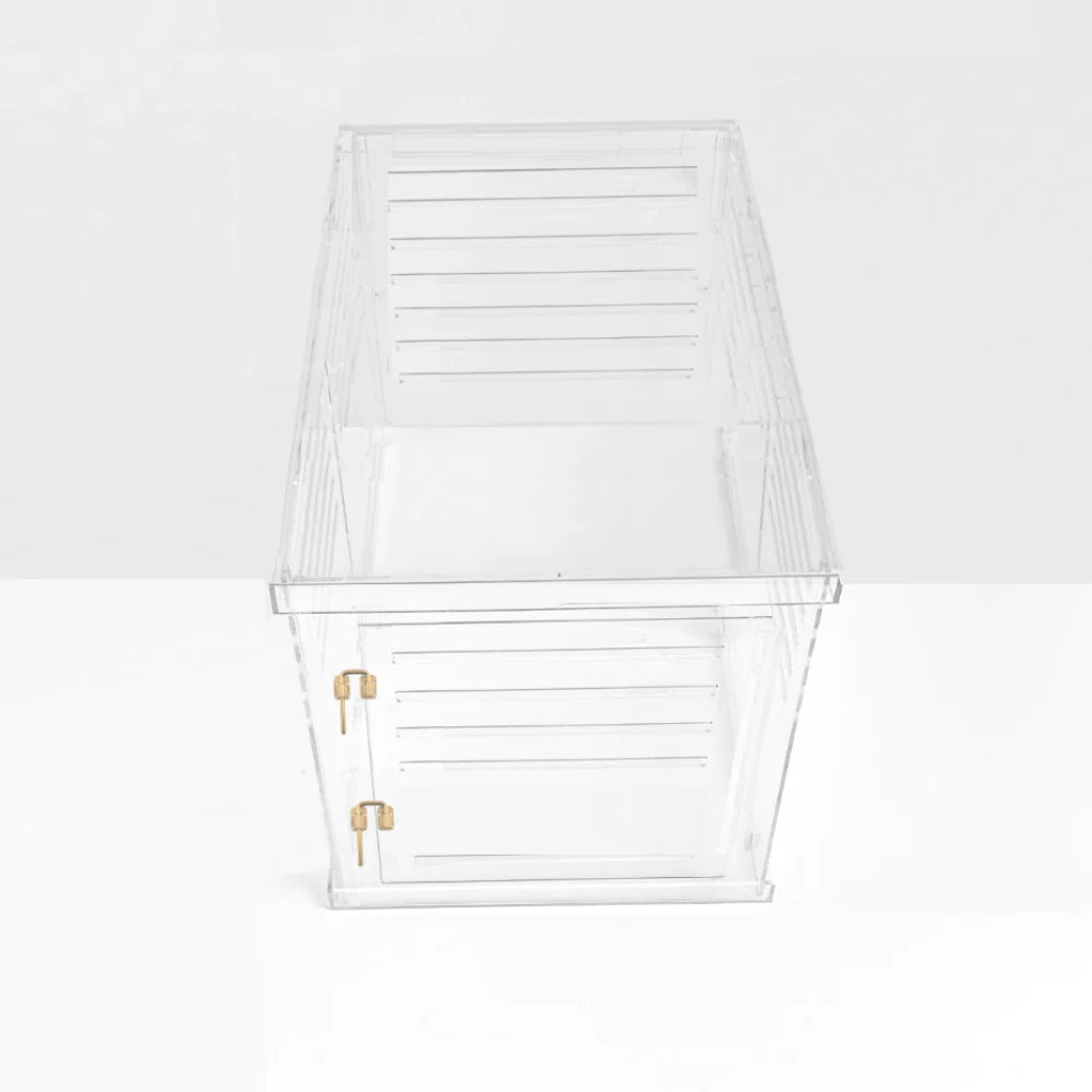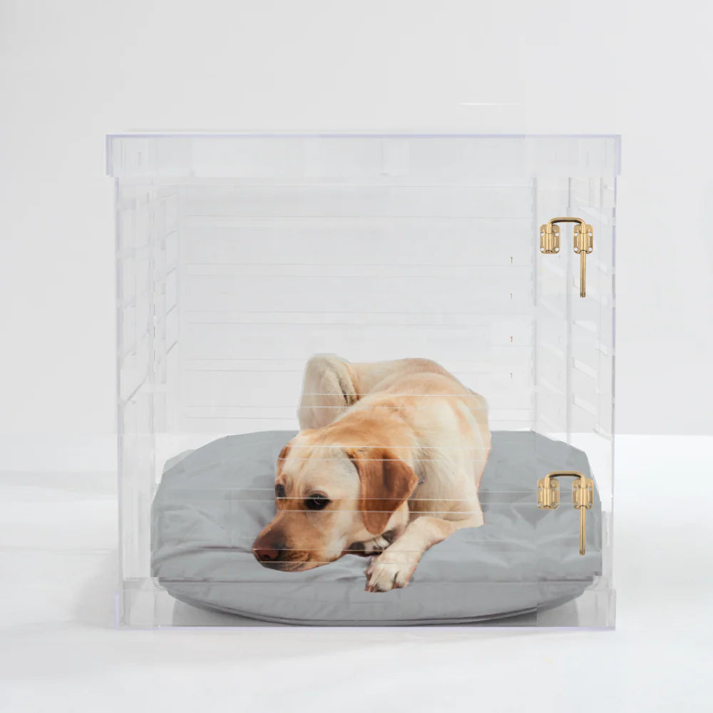 Designed for style, comfort, and peace of mind, the Clear Acrylic Dog Crate - Large offers an elevated space for your dog while blending seamlessly into any home décor. Made from high-quality, crystal-clear acrylic, this crate is the only fully transparent pet crate on the market. Its clear walls allow your dog to see their surroundings, reducing stress and promoting calm, relaxed behavior.