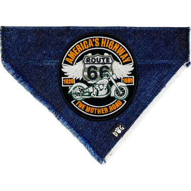 Hit the open road in style with the Route 66 Denim Bandana for Dogs! Inspired by America’s most iconic highway, this rugged accessory is perfect for pups with a love for adventure and a flair for freedom. The bold embroidered patch featuring a winged motorcycle and the words “America’s Highway - The Mother Road” gives your dog’s look a cool, road-trip-ready vibe.