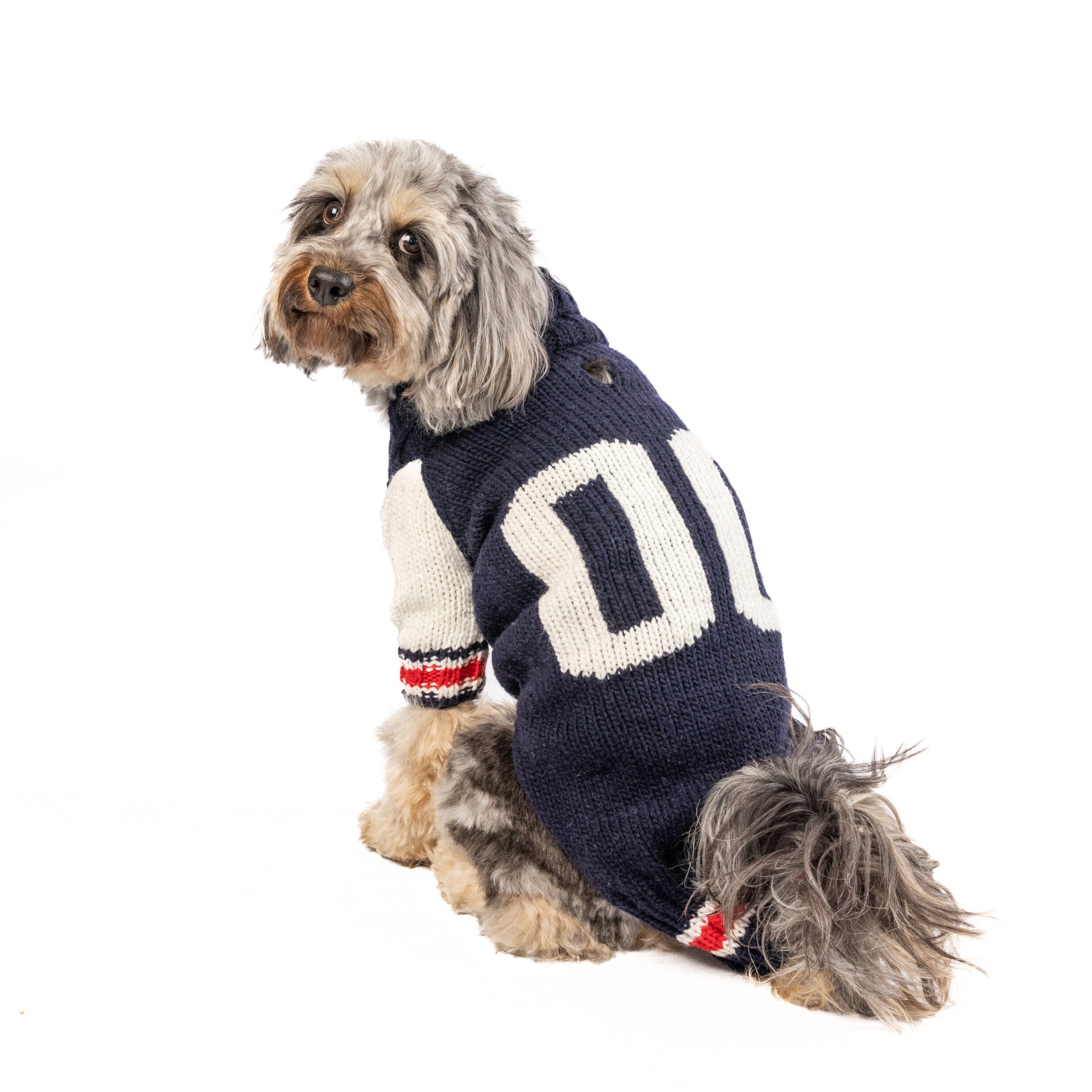 Get your pup game-day ready with our Varsity Game Day Dog Sweater, a timeless design inspired by classic blue and white jersey colors. This cozy hand-knitted pullover brings sporty charm and all-day comfort to your furry friend’s wardrobe. Designed with a leash-slit in the neck area, it offers convenience for walks while keeping your dog warm and stylish.
