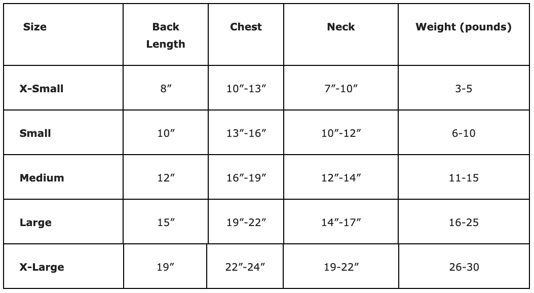 Available Sizes: X-Small through X-Large (fits dogs from 3 to 30 lbs).