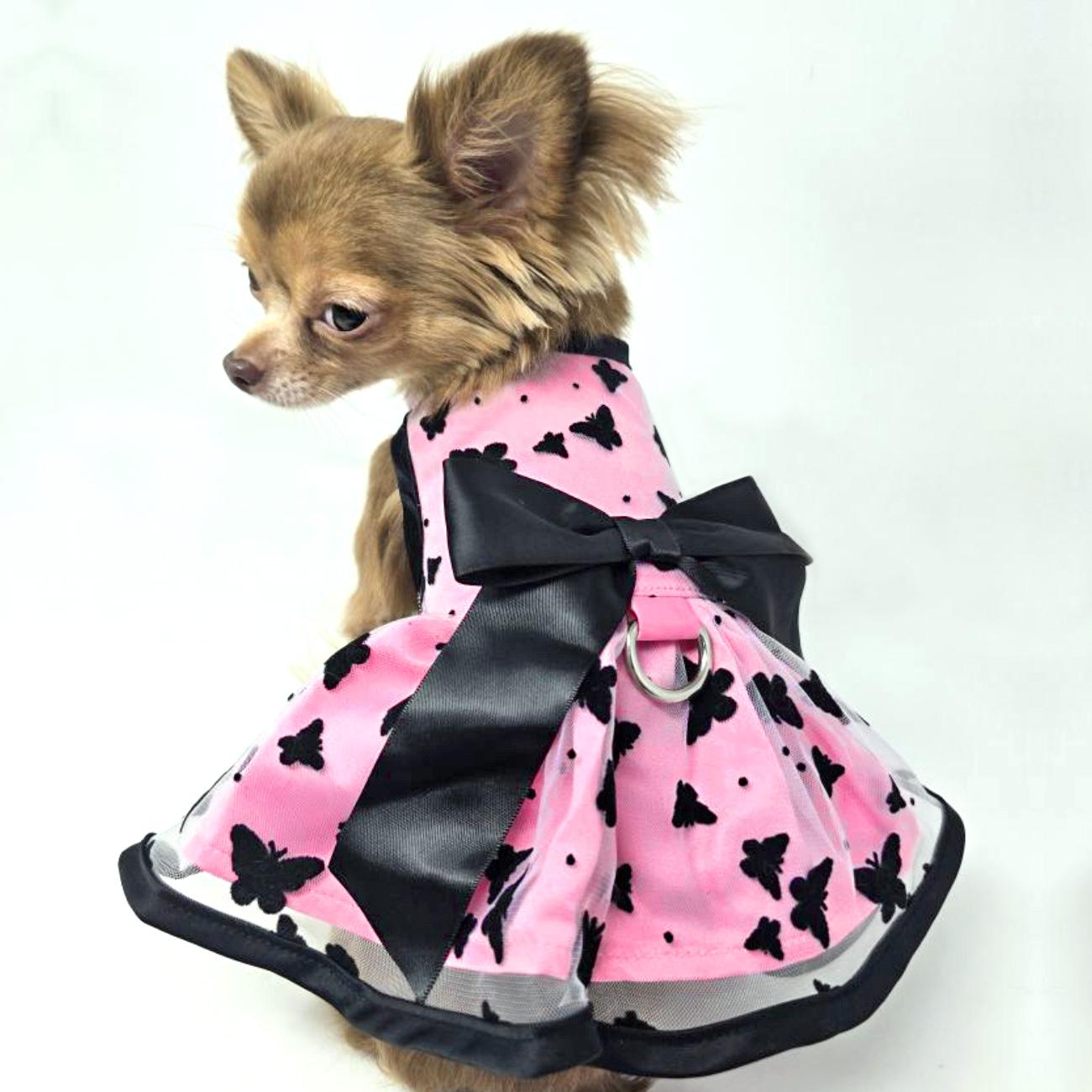 You’ll be all aflutter over our Pink Butterfly Dog Dress, a charming blend of elegance and whimsy for your fashionable pup. This beautiful dress features a soft pink satin bodice with black trim and a flowing butterfly tulle overlay, creating a graceful, eye-catching look that’s perfect for any special occasion.