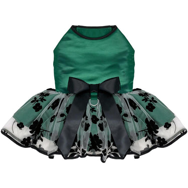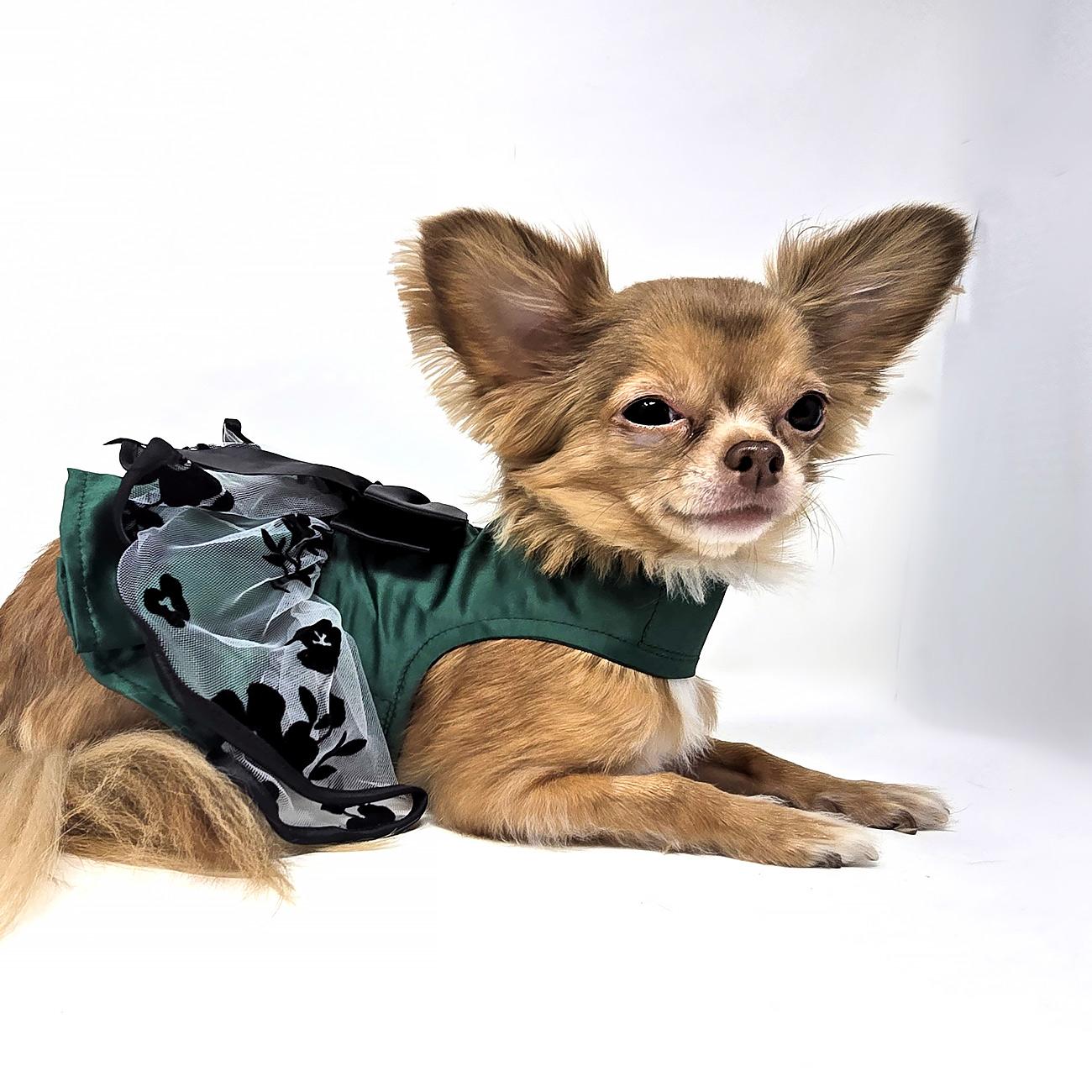 Let your pup shine in timeless elegance with our Green Satin Dog Dress, the perfect choice for stylish pets who love to make an entrance. This stunning dress features a luxurious green satin bodice paired with a white tulle overlay adorned with black velvet flowers, creating a sophisticated and glamorous look for any special occasion.