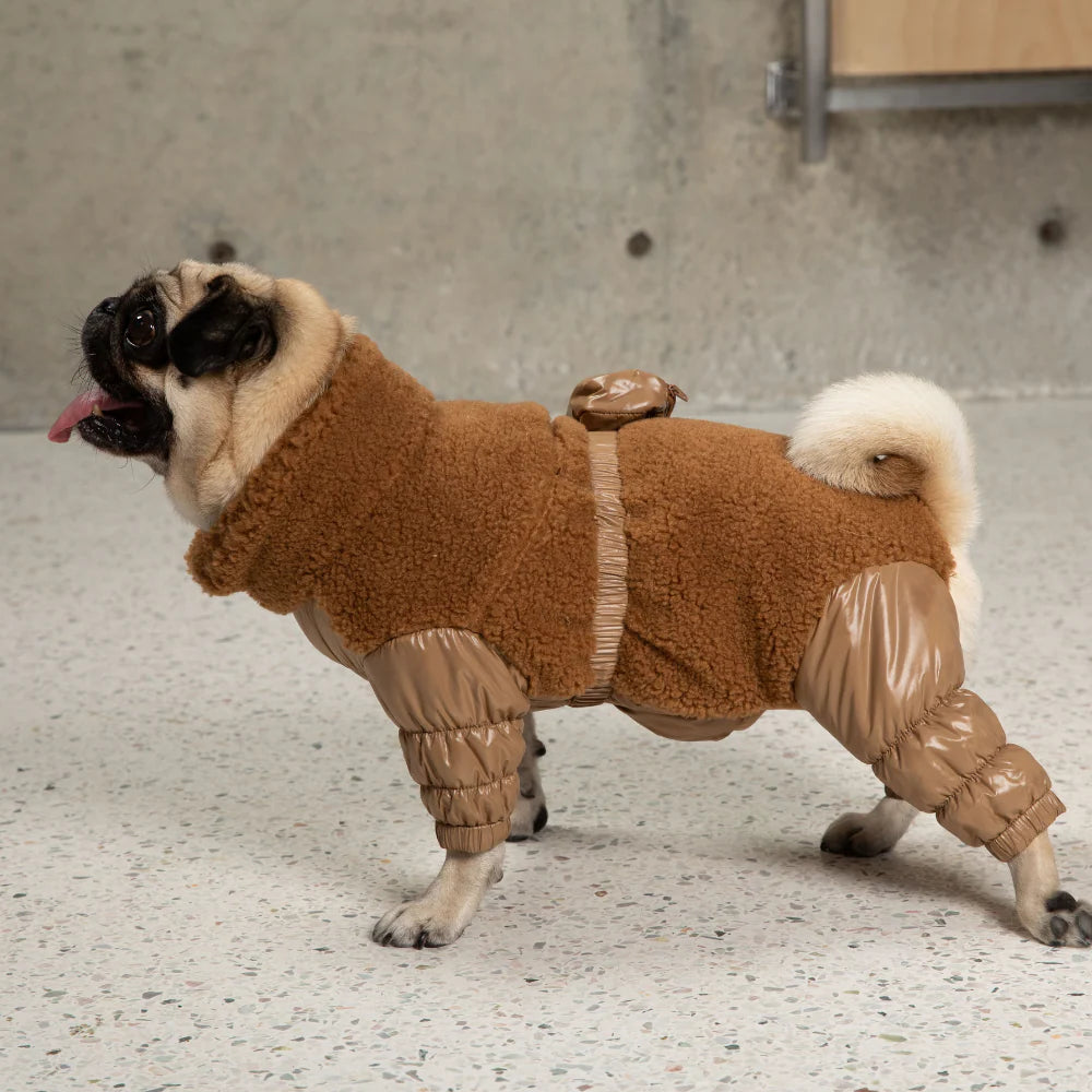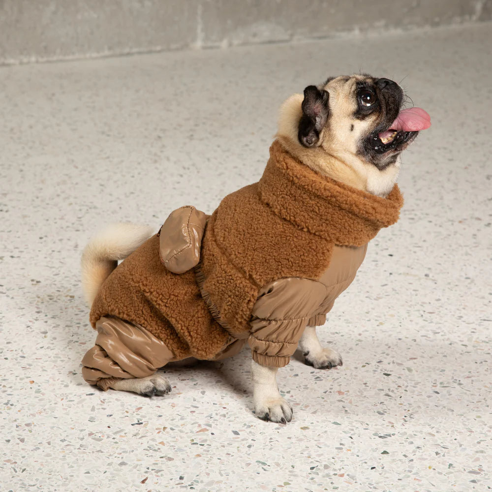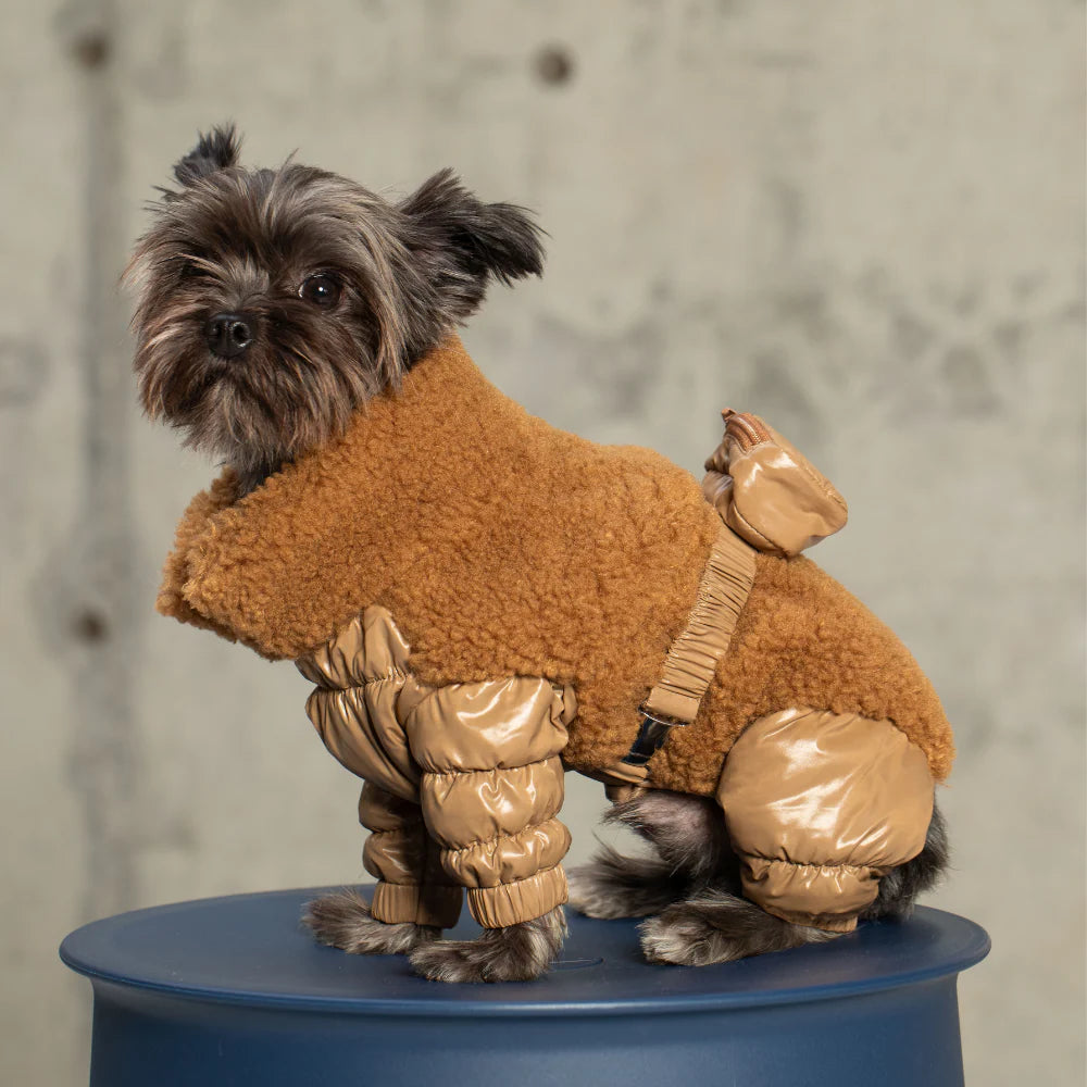 Meet the Sherpa Onesie in Brown - the ultimate blend of luxury, comfort, and performance for your pup. Crafted for all-weather protection, this premium dog outfit is engineered with a water-resistant exterior and 3M™ Thinsulate™ insulation to keep your four-legged companion warm without compromising mobility.