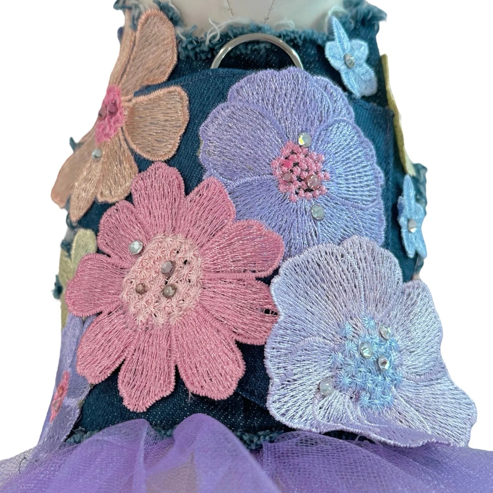 Each dress is one-of-a-kind; shades of denim and flower placement may vary, ensuring every creation is as unique as your pup. Please refer to the size chart in the last photo before ordering.