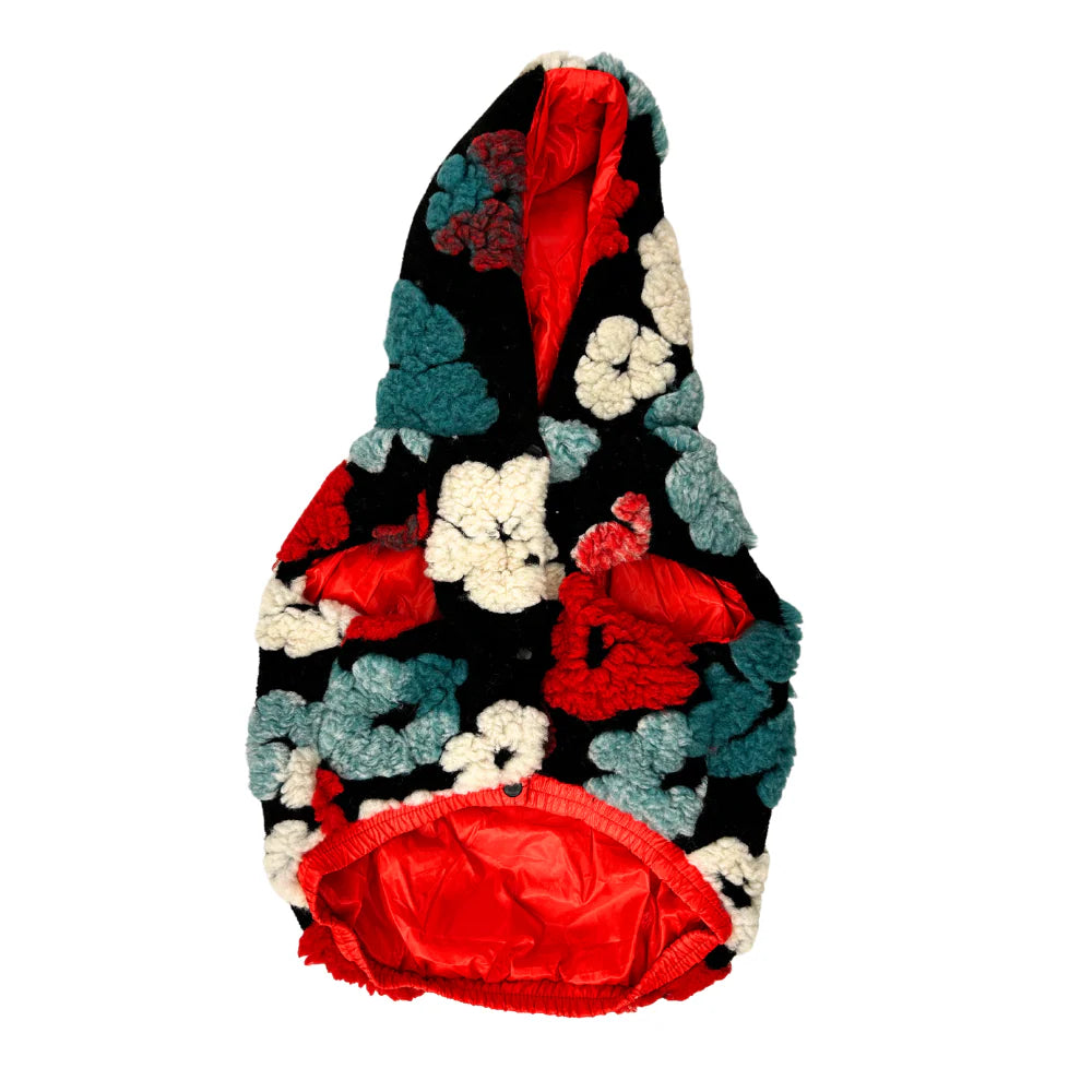 The Over the Top Vest is made for dogs who love to be extra and never shy away from attention. With a bold reversible design, this vest offers two fashionable looks in one. The semi shiny water resistant and windproof shell protects against rain, snow, and chilly winds. Flip it inside out and the plush floral sherpa interior keeps your pup cozy and stylish.