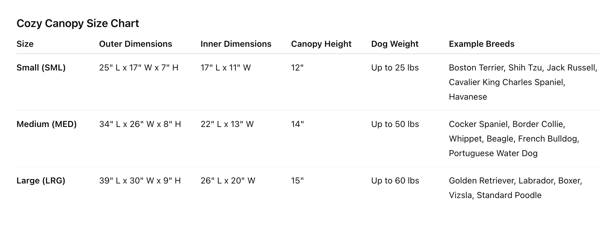 Small: 25" L x 17" W x 7" H — for dogs up to 25 lbs (Boston Terrier, Shih Tzu, Jack Russell, Cavalier King Charles Spaniel, Havanese)
