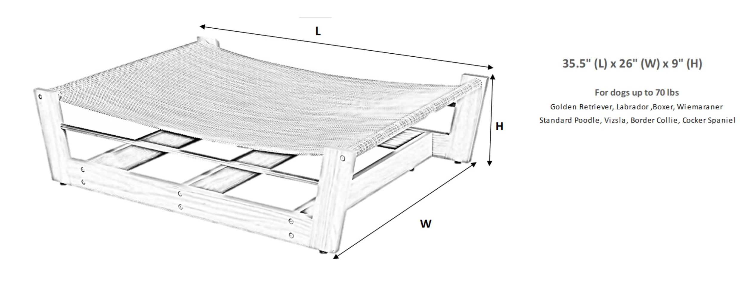 Crafted from lightweight yet sturdy wood, The Urban Hammock elevates your dog above the floor to encourage airflow and create a supportive, calming rest experience. The durable nylon mesh surface is designed to contour to your dog’s body, relieving pressure points and providing orthopedic benefits that support overall health and mobility. Temperature-regulating and breathable, it ensures comfort in every season.