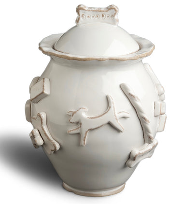 This White Ceramic Dog Treat Jar is crafted from durable stoneware and finished with a smooth, glossy white glaze, this handcrafted jar is both beautiful and functional. Each piece features raised appliqué details of dogs and bones, giving it a charming artisan look that celebrates your furry friend in style.