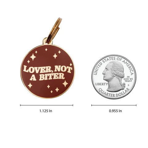 Show off your pup’s sweet side with the Lover, Not a Biter Dog ID Tag - the perfect accessory for dogs who lead with love (and maybe just a little sass). Featuring gold lettering on a warm brown enamel base surrounded by twinkling stars, this tag delivers charm, humor, and heart all in one stylish piece.