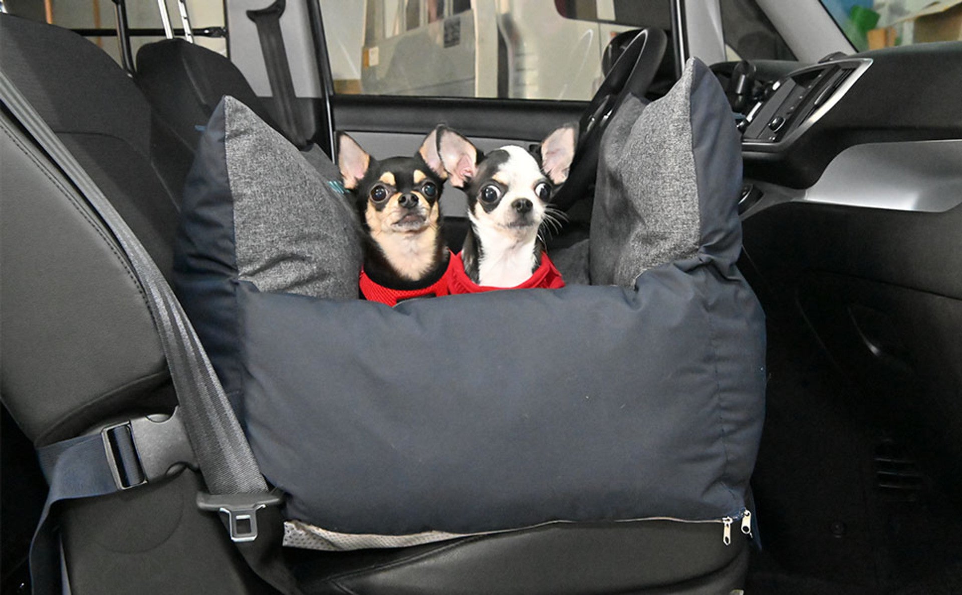 Navy Dog Car Seat with carrying handles for easy transport to and from the car. Size Medium includes 1 safety strap and Size Large includes 2 safety straps inside to accommodate up to 2 dogs.