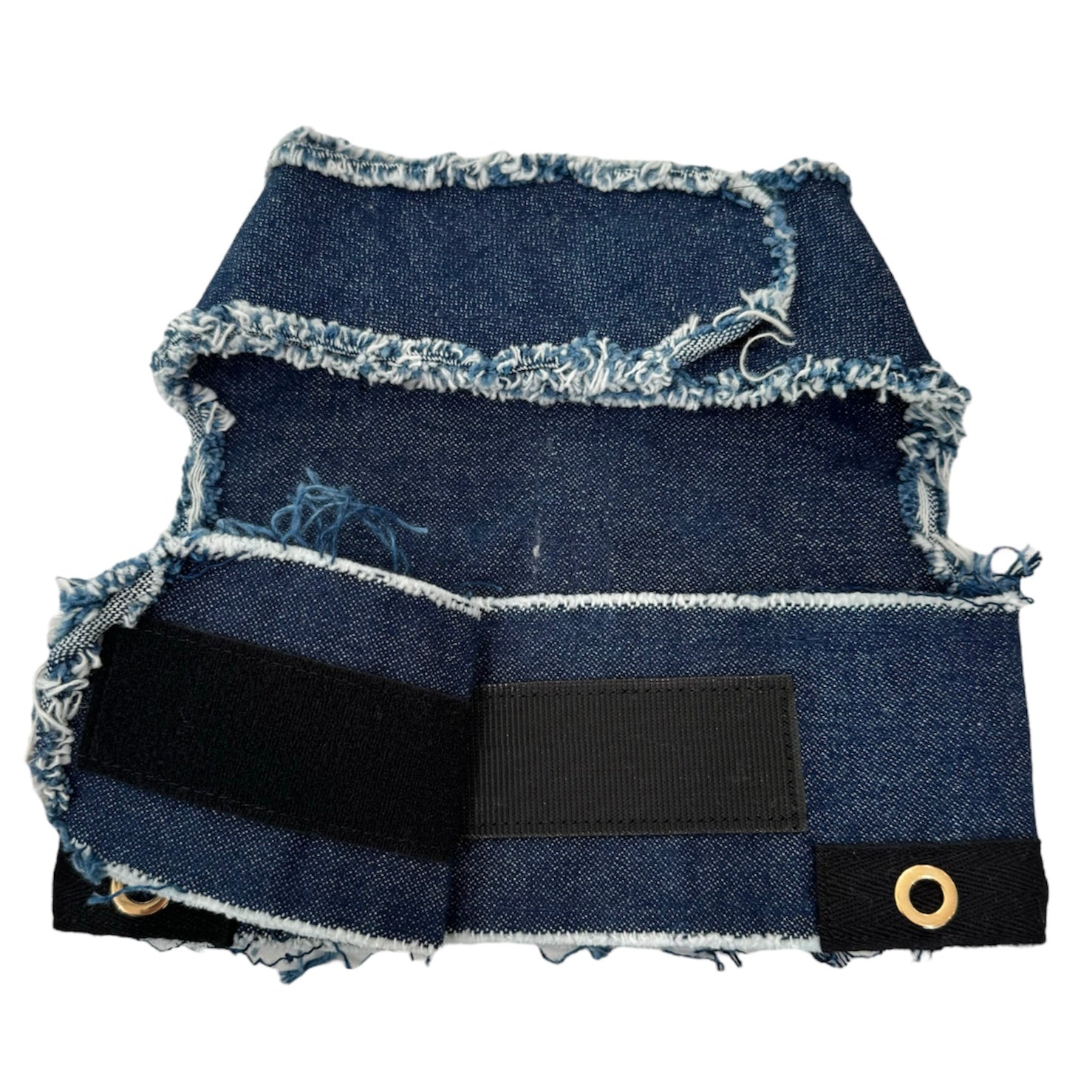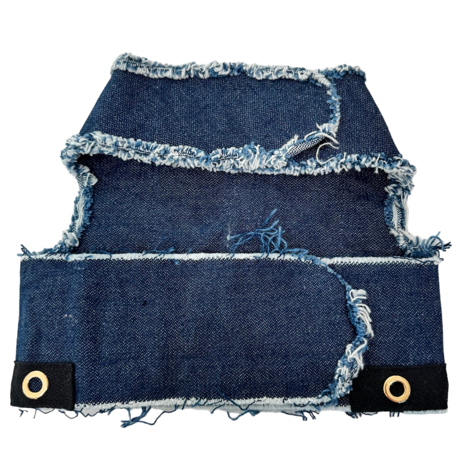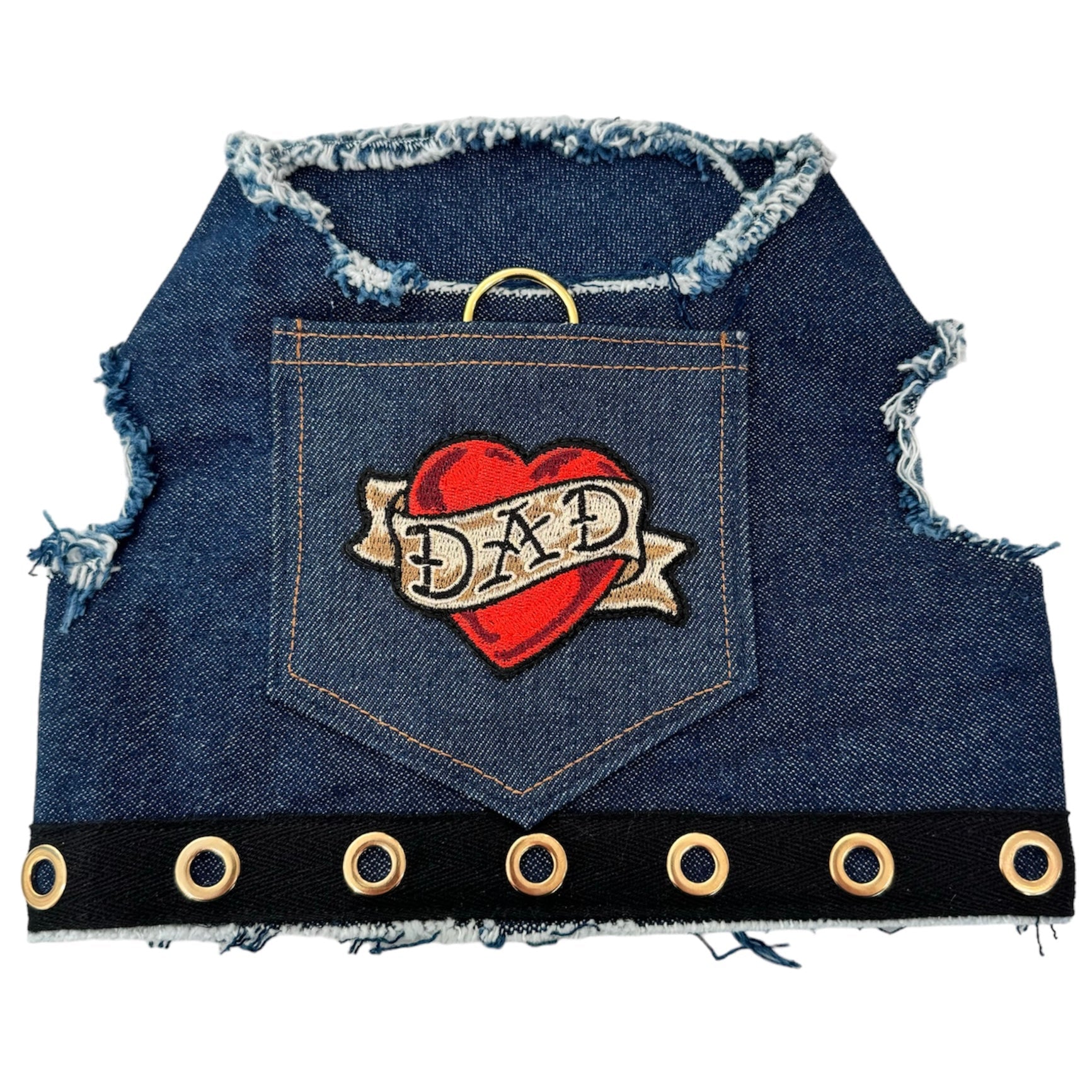 Celebrate your favorite guy with this bold denim harness that’s perfect for pups who love their dads. Crafted from dark indigo denim and detailed with gold grommets, each harness features a repurposed denim pocket and a classic tattoo-style “DAD” heart patch that captures vintage biker charm. Designed with both style and comfort in mind, it includes a gold D-ring and secure hook-and-loop fasteners for easy wear. Made from reclaimed denim, each piece is slightly unique in shade and texture. Check the size chart to ensure the perfect fit for your four-legged trendsetter.